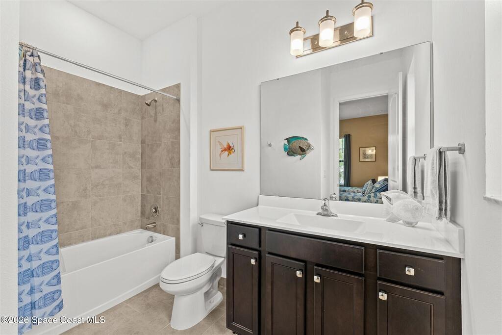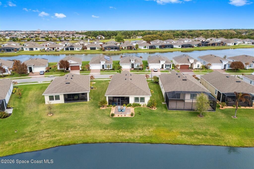 Immaculate 3 bedroom plus study, 3 1/2 bath, waterfront home in Bridgewater, Viera's popular gated 55+ resort style community. All three bedrooms are en-suites, making the Key Largo the most popular floorplan! This barely lived in home has plank tile floors in the main living areas, ceiling fans, and 8' doors. Great room has triple sliders to the screened in porch and additional paver patio and lake beyond! Exterior landscaped beds are bordered with designer curbing and stone. And all windows and the sliders have accordion shutters for added peace of mind! Delightful kitchen with espresso kitchen cabinets with tile backsplash and an island with stunning pendant lights! Dream laundry room with W/D, cabinets and a sink! Oversized primary bedroom and primary bath with a huge walk-in closet with custom built-ins! Unbelievable clubhouse w/ heated pool and spa, movie theater, fitness center, coffee lounge, tennis, pickleball! Close to shopping, restaurants, ocean beaches, cruise port!
