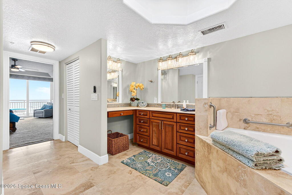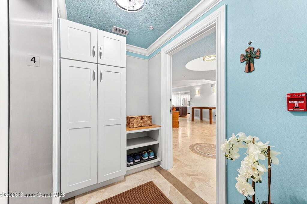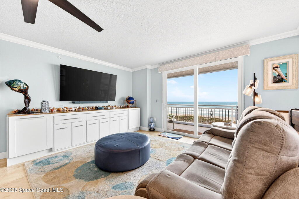 Discover breathtaking ocean and river views from this stunning southeast corner 3-bedroom, 3-bath residence at The Carlyle in South Cocoa Beach. Step directly from the secure elevator into your private vestibule and experience the thoughtful custom details throughout. Flooded with natural light, the spacious open-concept floor plan creates an inviting living environment. The meticulously chef's kitchen features rich wood cabinetry, an oversized island with seating, a gas cooktop with a sleek vent hood, and premium stainless steel appliances. Completely open to the living, dining, and conversation areas, the kitchen offers sweeping views of the ocean and centers around a cozy fireplace.New impact sliding glass doors beautifully frame the picturesque scenery of the ocean and river, while full home shutters provide added peace of mind. Enjoy morning coffee on the east balcony as the sun rises over the Atlantic, and unwind on the west balcony with spectacular sunset views over the river.