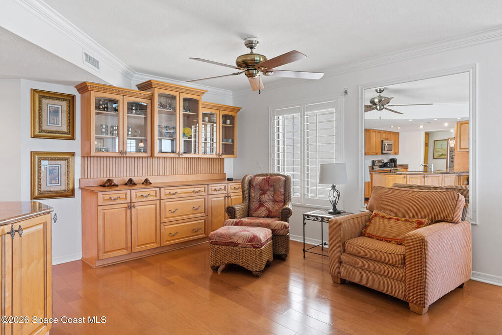 Wake up to breathtaking ocean views from this 4th-floor corner residence in Sterling House, where light-filled interiors and an open-concept design create an inviting coastal retreat. A spacious screened lanai is the perfect spot for sunrise mornings or unwinding with the soothing Atlantic breeze. The condo features an updated kitchen with granite countertops, crown molding, plantation shutters, and beautiful wood flooring throughout. Additional highlights include a tankless water heater and storm shutters (mostly electric). Convenient under-building parking with private storage adds ease. The residence may convey turn-key for effortless move-in.Live like you're on vacation every day with the turquoise ocean and pristine white sand beach just outside your door, along with a heated pool, tennis and pickleball courts, and nearby golf courses. Concrete restoration is complete--making this the perfect time to move in and enjoy this welcoming community near the renowned Sebastian Inlet.